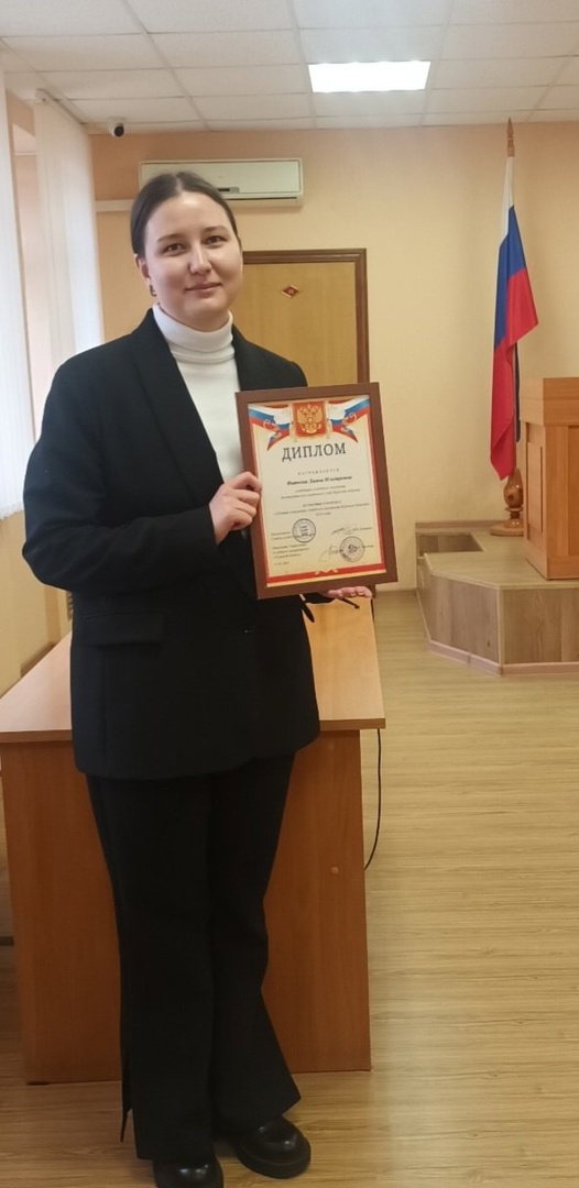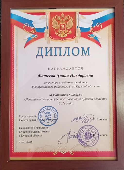 Секретарю судебного заседания Фатеевой Диане Ильдаровне вручён диплом за участие в конкурсе "Лучший секретарь судебного заседания Курской области 2024 года.
