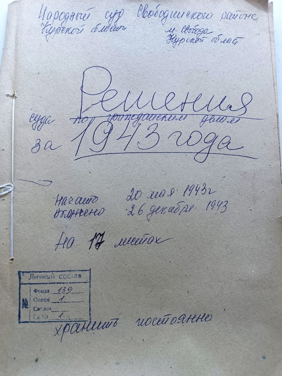 3 июня 1943 года народным судом Свободинского района Курской области в составе председательствующего судьи и двух народных заседателей вынесено решение об удовлетворении заявления Федора Естифеева о признании его жены умершей во время бомбардировки.